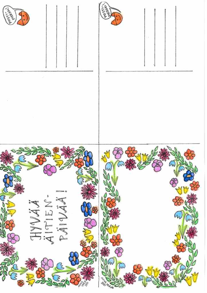 Tee äidille kortti äitienpäiväksi! Voit joko tulostaa valmiiksi väritetyn kortin tai mustavalkoisen, jonka värität itse.