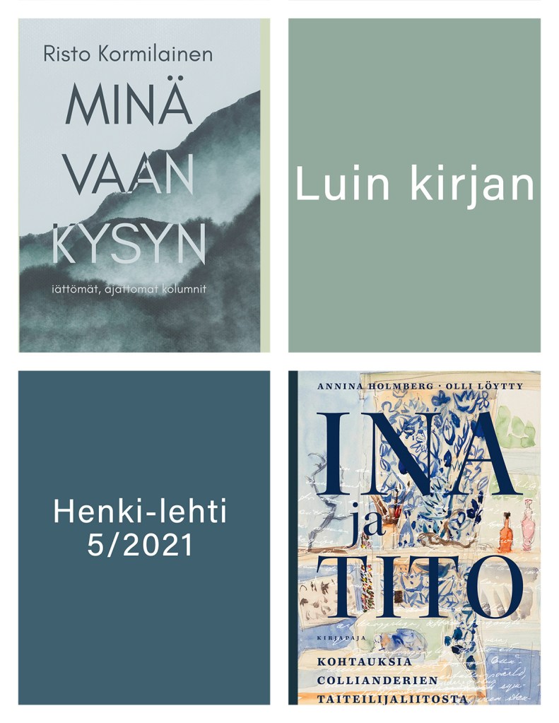 Risto Vähäsarja arvioi Risto Kormilaisen kirjan Minä vaan kysyn (Väyläkirjat 2021)ja Taru Kivineva arvioi Annina Holmbergin ja Olli Löytyn kirjan Ina ja Tito. Kohtauksia Collianderien taiteilijaliitosta (Kirjapaja 2020).