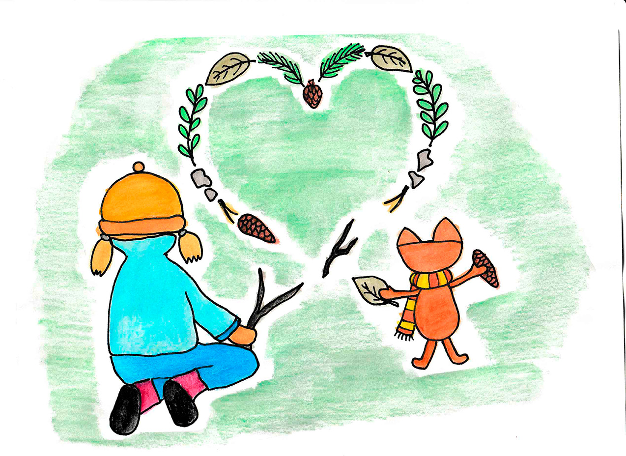 Tarinassa Sanni ja Köppänen tekivät taideteoksen pihalle. Millaista taidetta sinä tekisit ulkona luonnomateriaaleista? Lähetä valokuva taideteoksestasi osoitteeseen kaisa.viitala@h-y.fi, niin se julkaistaan tällä sivulla!