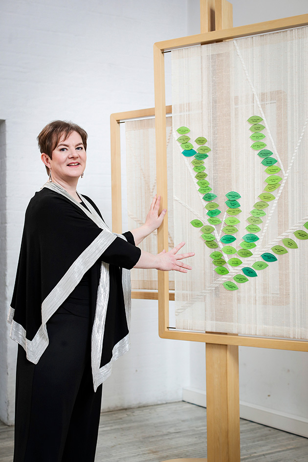– Kirsti pyysi minua kutomaan siihen valkoisen, läpikuultavan ja vaihtelevan kankaan, jossa näkyy hänen suunnittelemansa oksakuvio paksusta langasta tehtynä. Kastettujen lasten nimet kirjoitetaan vihreille