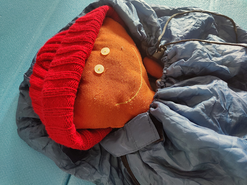 Kangaskasan alta kuului tyytyväinen hyräily, ja välillä Köppäsen korvanlehti pilkisti jonkin läpän alta esiin. Sanni ja mumma kokosivat tukikeppejä ja pujottivat niitä paikoilleen kankaassa oleviin kujiin. Pian teltta oli valmis.