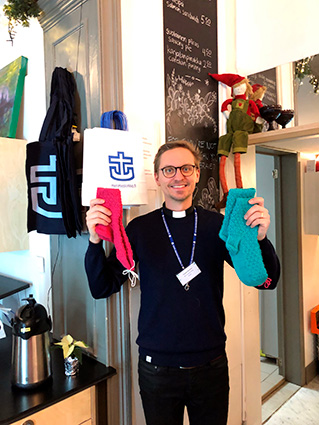 Saman kutsuvan ja avoimen asenteen tunnistan myös Tuomas Meurmanissa. Hän pitää työstään ulkosuomalaisten pappina juuri siksi, että se on niin vaihtelevaa ja monipuolista. Jumalanpalvelukset ovat tärkeitä, mutta monet matalan kynnyksen kohtaamiset tapahtuvat arjessa. Silloin pappikin saa toimia tehtävissä, jotka kotimaan seurakunnissa harvoin kuuluvat hänelle. Tuomas palvelee milloin Merimieskirkon Suomi-kaupan kassalla, milloin tarjoilemassa kahvilan pullia, papinpaita päällä.