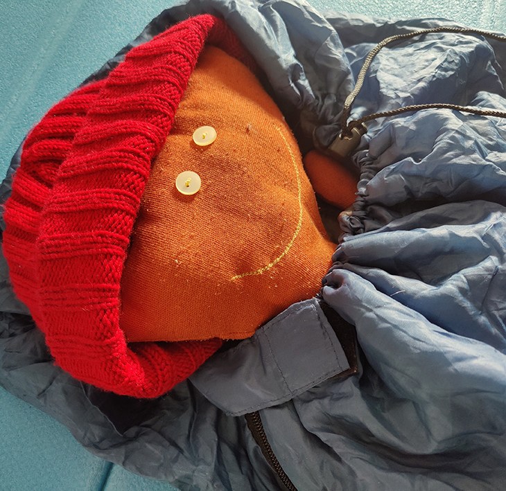 Kangaskasan alta kuului tyytyväinen hyräily, ja välillä Köppäsen korvanlehti pilkisti jonkin läpän alta esiin. Sanni ja mumma kokosivat tukikeppejä ja pujottivat niitä paikoilleen kankaassa oleviin kujiin. Pian teltta oli valmis.